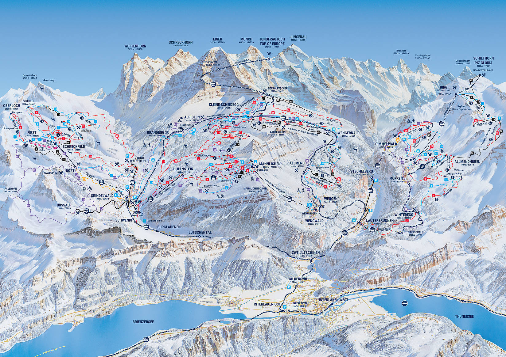 Dramatically set in magnificent scenery directly beneath the towering north face of the 4,000 metre high Eiger. This ski resort has extensive, gentle runs, ideal for intermediates, who will revel in the red runs that are offered at both "First" and the Kleine Scheidegg/Männlichen areas. There are also links to Wengen, which makes for a collective ski area of around 160 kilometres. Beginners can test their skills on the nursery runs at Bodmi, located at the top of the village, and then head to the blue runs on the "First" ski area.