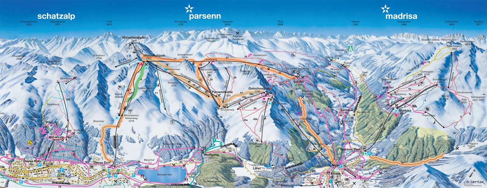 The Klosters/Davos Rega ski-pass will give you access to a wonderful 320 kilometres of runs, serviced by an extensive lift system of cable cars, chair lifts, railways and draglifts. One of the most favourite runs in the extensive Gotschna/Parsenn area is the descent from the Weissfluh to Kublis. The Madrisabahn Gondola opens up a further 50 kilometres of slopes offering an extensive area of skiing of intermediate level. Snowboarders will find ideal slopes on Gotschna and Madrisa, which is particularly well suited for beginners. Freeriders too, will find natural obstacles and richly diversified runs in the area between Switzerland and Austria. In addition, the Davos slopes complete the local offer with half-pipes and fun parks. There is also a bordercross-park on Madrisa.