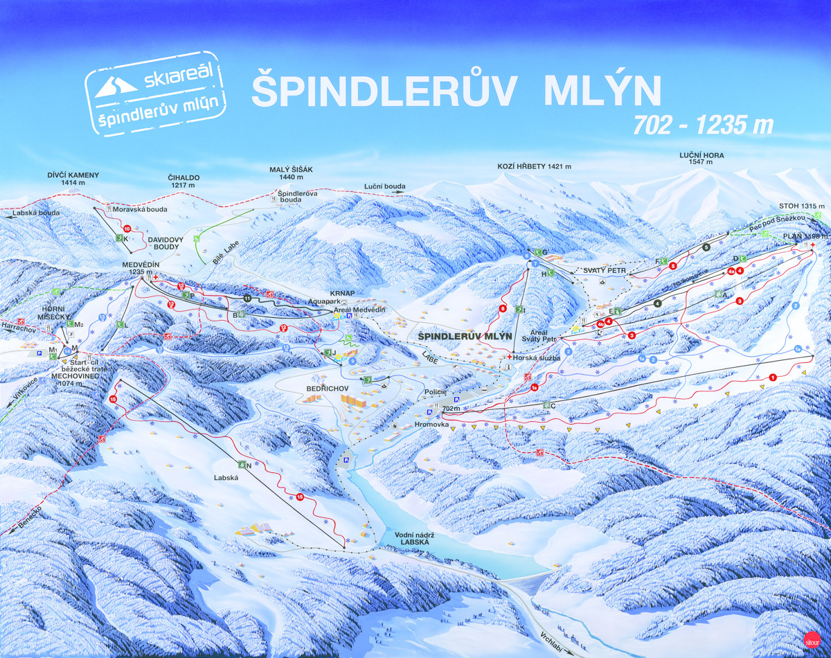 This is the largest resort in the Czech Republic, located just 2.5 hours north of Prague in the heart of the Krkonose the 'Giant Mountains'. The two major ski areas are Svaty Petr (Saint Peter) and Medvedin, situated on each side of the village approximately 1.5 kilometres apart. A Free ski shuttle buses connect the two ski areas.
