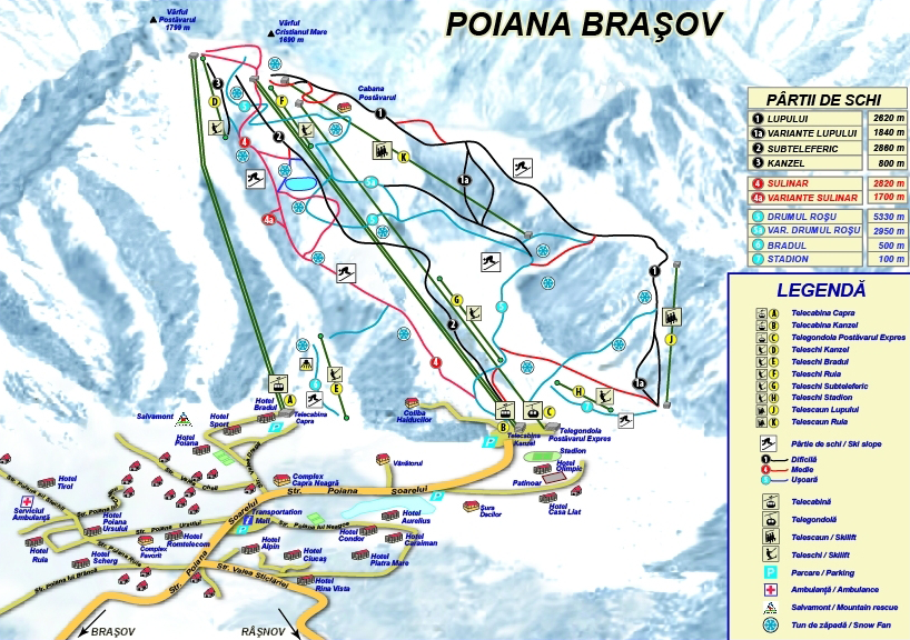 2.5 hours north of Bucharest and 13 kilometres from the medieval town of Brasov. Internationally renowned and highly regarded Poiana Brasov is Romania's most popular ski resort and one of the best value for money ski resorts in Europe with a very high customer satisfaction rate. This purpose built resort has developed an enviable snow record over many years. The resort offers great skiing and snowboarding combined with an outstanding cultural experience. The excellent layout of the ski runs allows advanced skiers and snowboarders to "let go" without fear of interfering with beginners and intermediates to master the more advanced techniques in a spectacular environment.