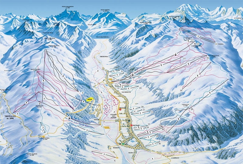 Livigno is a high altitude ski resort and a duty-free haven set along the Valtellina alpine valley, offerring plenty of entertainment and accommodation catering for all tastes and pockets . The resort has retained much of its traditional architecture and consists of three villages namely, San Antonia - in the resort centre, San Rocco to the south and Santa Maria to the north. The ski area covers both sides of the resort, offering a good variety of snow sure skiing, easily accessible from a super-efficient modern lift system. The west facing slopes comprise Costaccia and Carosello both accessible from the valley floor and Mottolino, on the opposite side is reached by the gondola from Teola. The ski area is an intermediates playground with a host of interlinked red runs to conquer. For experts in search of steep and deep powder, you will not find a great deal without the help of a local guide, however there are some black runs off Monte delle Neve but not enough to keep the seasoned expert entertained. You could also head to St. Moritz for a day, and a lift pass bought from Livigno usually includes one day at this famous Swiss resort.