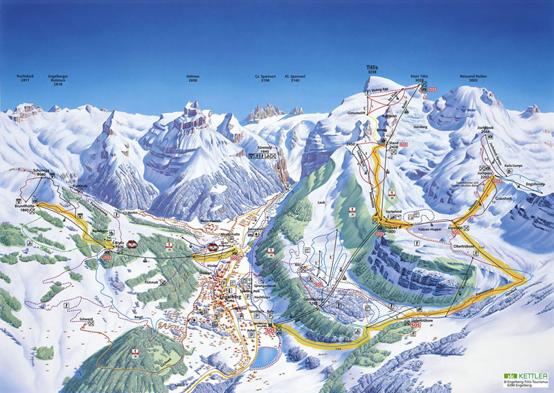 Beginners should try the Gerschnialp and Untertrübsee, both with ideal flat terrains. They are easily reached from the base station, with a blue run back home to the finish. Advanced skiers can try many of the steep black runs across the Titlis and Jochstock areas. Skiing the length of either the Trubsee-Stand cable car or the two chairs between Jochstock and Alpstubli at the western end of the Trubsee will give you a sustained descent of 600 and 800 vertical metres. Intermediates have around 55 kilometres of red runs, about 60% of the groomed terrain Engelberg has on offer. For experienced snowboarders there are outstanding off-pistes on both the Brunni and the Titlis areas, however most of the jumping will take place within the main terrain park at the bottom of the Jochpass Express chair-lift. There are numerous jumps, rails, a half pipe and a quarter pipe for you to test your skills on. The park is also continually being updated and improved.