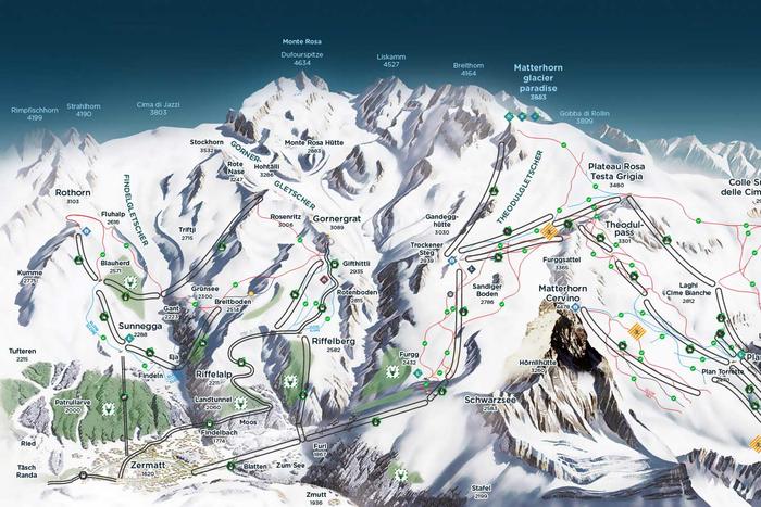 The skiing in Zermatt is split into 5 areas known as Schwarzsee, Glacier, Gornergrat, Sunegga and Rothorn and there are also the slopes of Italy's Cervinia tantalisingly close by for all the powder hungry skiers who are keen to cover lots of kilometres. Pit stops are also strongly recommended as the mountain restaurants are second to none and the perfectly placed to fill you up with mouth-watering food and a well-earned tipple during a day of exceptional skiing. Zermatt is not the best place for those new to the snow as the slopes can get very busy and many of the runs are more geared for seasoned skiers, however, the runs around Sunnegga will provide some decent terrain to improve your skills.